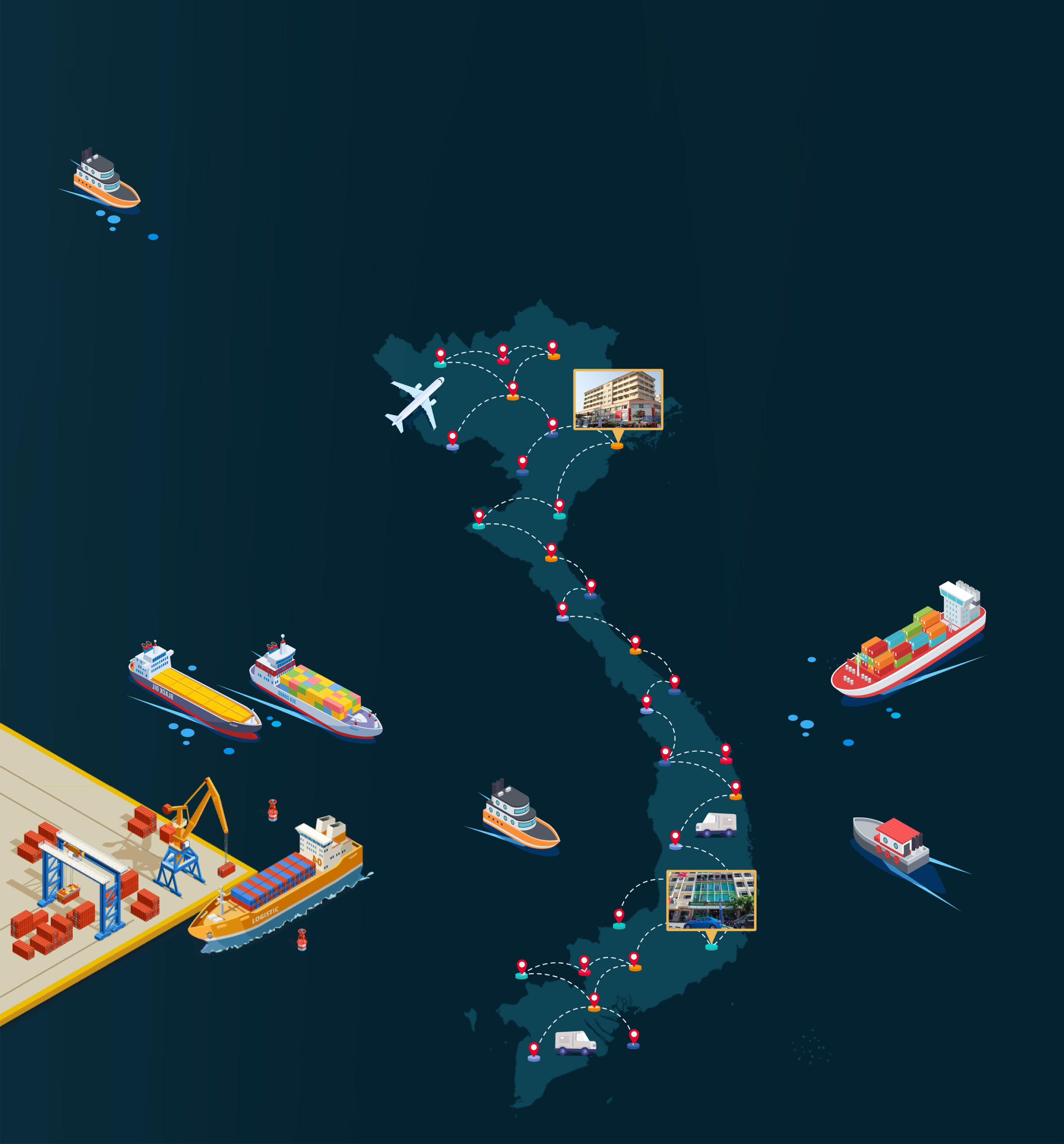 Our nationwide network of ambient & cold warehouses fully meets product preservation needs. Strategically placed sites across Vietnam enable seamless connection & fastest delivery to supermarkets, city centers, and suburbs – optimizing lead time & ensuring product quality in transit.