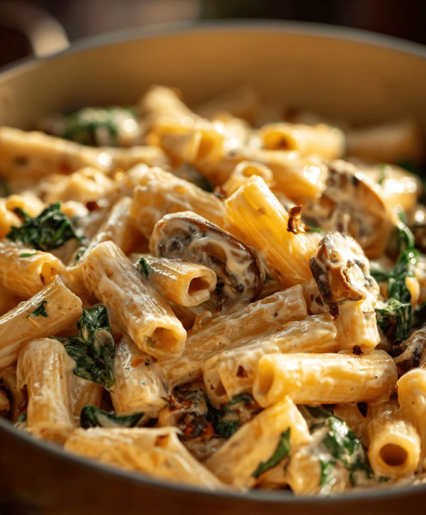 Add the cooked Sedani Rigati, chicken, and mushrooms into the cream sauce. Toss gently for about 2 minutes, allowing the sauce to coat and seep into the “Rigati” ridges of the pasta.