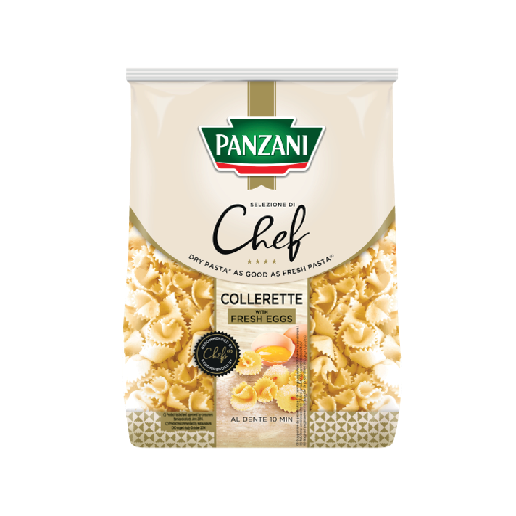 This special and elegant shape makes Collerette pasta a highlight in every meal, making each plate of pasta more luxurious and impressive. Despite being a dried pasta, Collerette tastes remarkably fresh due to its simple ingredients: water, durum wheat, and eggs.